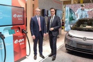 E.on und Volkswagen haben eine Lösung für das Laden von Elektrofahrzeugen vorgestellt, die relativ mobil ist und ohne aufwendige Anschlüsse auskommt. Die sogenannten Drive Booster sind Ladestationen für Elektroautos, deren zwei Ladepunkte mit jeweils 150 kW laden können. Im Inneren der Drive Booster stecken Akkus, die über einen herkömmlichen Stromanschluss von 16 bis 63 Ampere dauerhaft gespeist werden.
